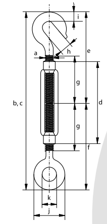 | Diş Çapı / a-mm | Kapalı Uzunluk / b-mm | Açık Uzunluk / c-mm | Gövde Boyu / d-mm | Dişli Aparat Uzunluğu / e-mm | Dişli Aparat Uzunluğu / f-mm | Diş Uzunluğu / g-mm | Kanca Açıklığı / h-mm | Göz Kalınlığı / i-mm | Göz Dış Çapı / j-mm | Göz İç Çapı / k-mm | Birim Ağırlık / Ad-kg |