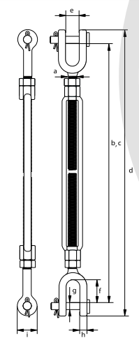| Güvenli Çalışma Yükü / t | Diş Çapı / a inch | Gerdirme Mesafesi inch | Pimler Arası Kapalı Uzunluk / b-mm | Pimler Arası Açık Uzunluk / c-mm | Kapalı Uzunluk / d-mm | Çatal İç Genişliği / e-mm | Çatal İçi Boyu / f-mm | Pim Çapı / g-mm | Çatal Kalınlığı / h-mm | Çene Göz Genişliğ /i-mm | Birim Ağırlık / kg |